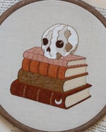 The design takes inspiration from Vanitas still life paintings and their focus on mortality and knowledge. The skull, books and subtle metallic details create a striking embroidered memento mori that captures the quiet beauty of the macabre.