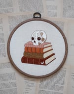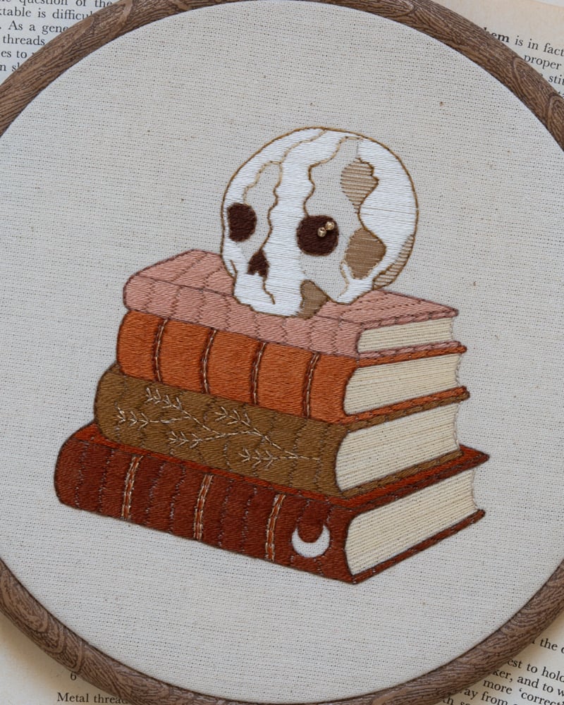 This is the original Memento Mori embroidery, created especially for my book Creepy Embroidery and photographed for the publication.