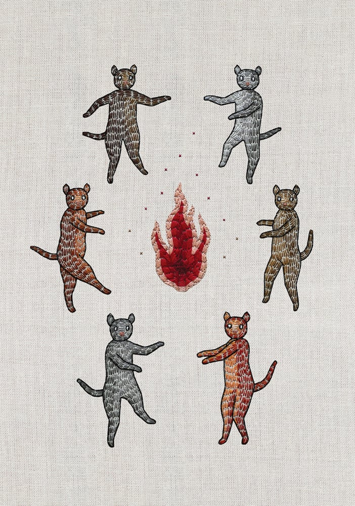 Six cats gathered under the mourning moon, their dance marks the moment the veil lifts.