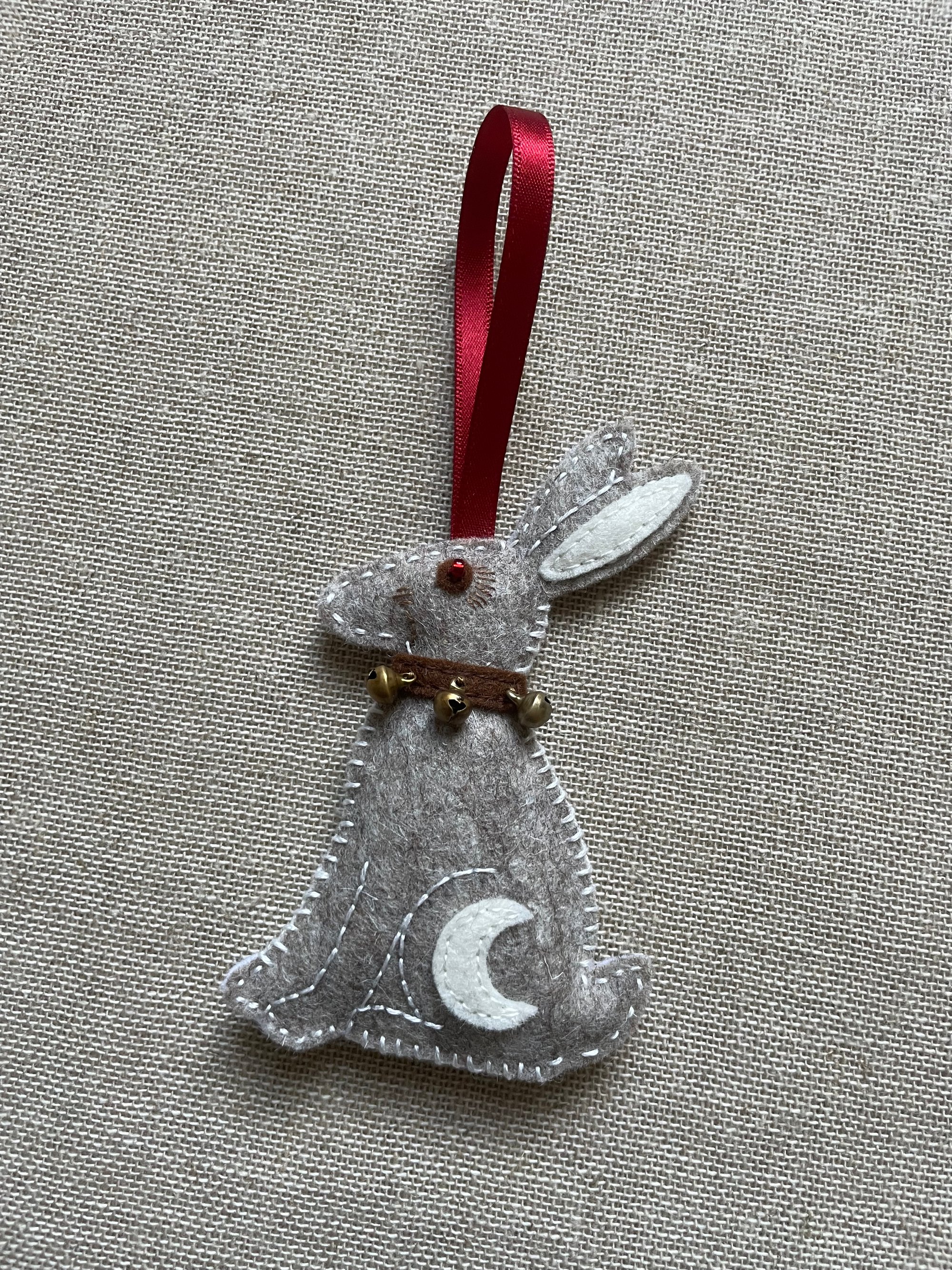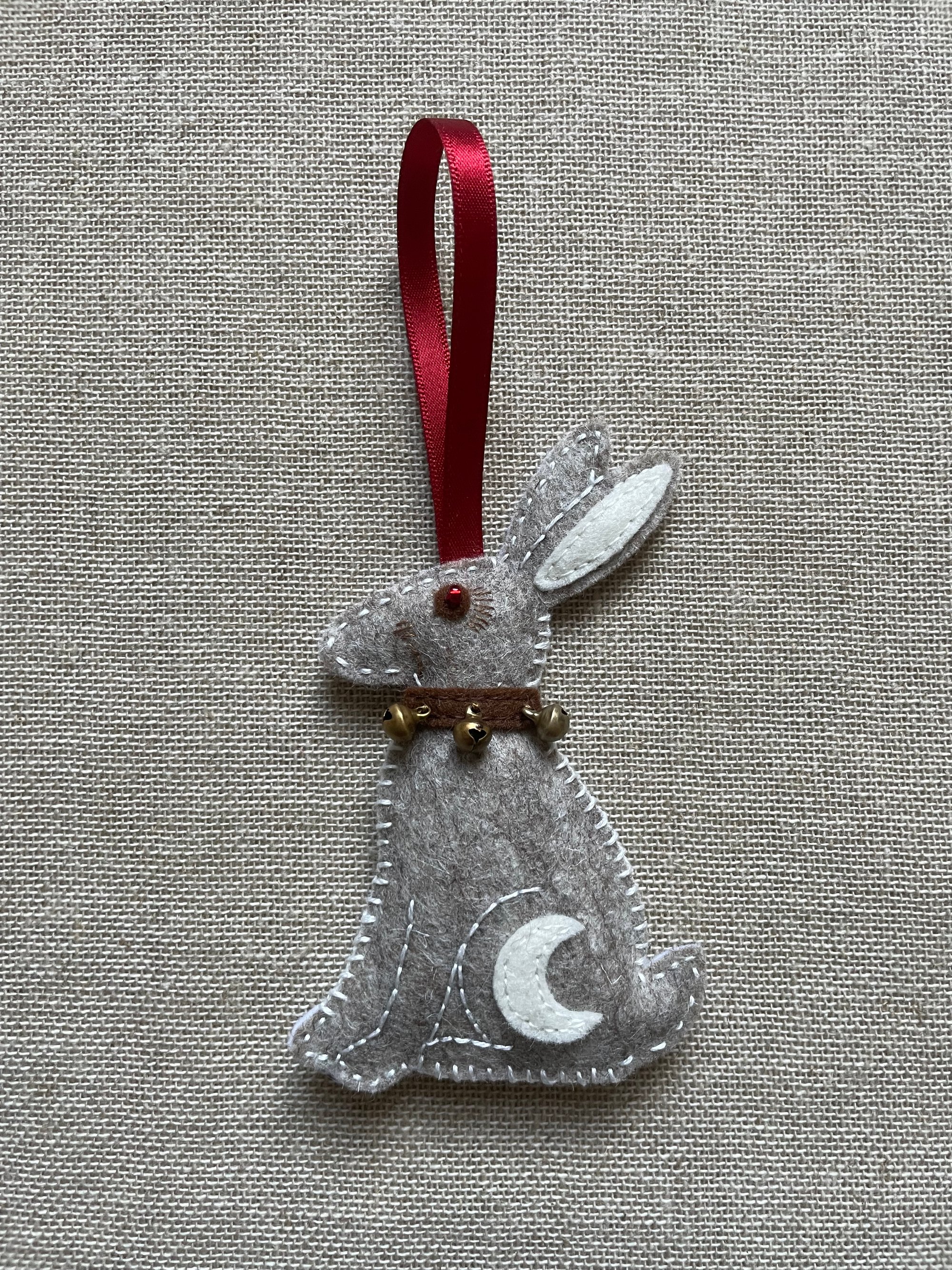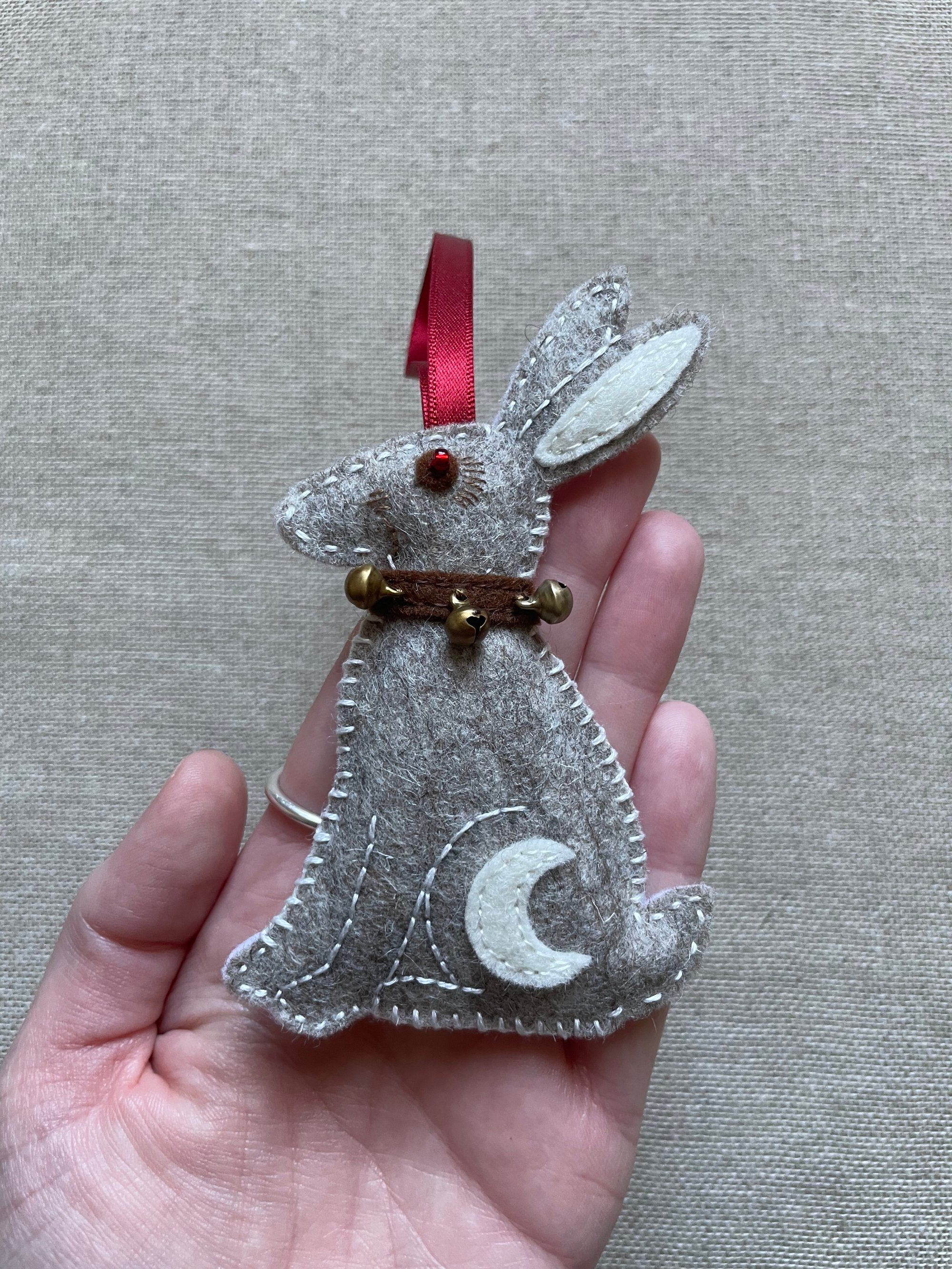 Made entirely by hand using 100% wool felt produced in Europe, the ornament is soft yet strong, naturally non-flammable, and created to hold its shape for many years. Each hare is finished with cotton stitching, embroidered details, and tiny bells that give a soft winter chime. Each piece is filled using the trimmed felt offcuts created during its making, an intentional choice to reduce waste and honour the materials.